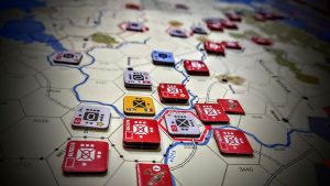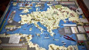 Ieri partenza con Downfall e la conclusione del primo turno di gioco che mi ha impegnato dal tardo pomeriggio fino a che mi è toccato andare a dormire. Obbligate consultazioni del primo approccio pratico a manuale (velocissime e non così tante, imho un esempio di come si scrivono ed organizzano i manuali. Una gioia leggerlo) e player aids (Molte. Ottimi che ti risparmiano spesso il viaggio sul rulebook) ed il setup (che ovviamente in due si sarebbe dimezzato, ma del resto il titolo di gmt non è che sia un fillerino ed ha bisogno di un po’ per farsi bello e mostrarsi in tutta la sua gloria), hanno richiesto diverso tempo. C’è la possibilità di piazzare anche due scenari di lunghezza breve e media (chiamati rispettivamente overlord ed husky) ma ovviamente la follia che alberga nei miei neuroni ha propeso senza indugio per la campagna totale. Partiamo quindi dall’autunno del 42 e procediamo con 8 turni di gioco. Per chi non conoscesse il titolo potremmo classificarlo come un mini-playable-monster strategico sulla ww2 teatro europeo-africa del nord per due giocatori. La particolarità sta nel fatto che uno controllerà i western allies + l’okh , mentre l’altro i russi + l’okw. Quindi c’è questa sorta di contrapposizione alla “Battle for Germany” ma in versione supersteroidi. La guerra sarà vinta (non che non ci sarà da sudare) ma niente robe troppo strane (grazie): corsa a chi la vince prima e come. Partiamo con un mini-report e dopo pochi ordini la situazione a Stalingrado è già chiara con la sesta impossibilitata a ritirarsi ed i russi che spingono con operazione Uranus propiziandone l’isolamento portando rinforzi ed iniziando attacchi da Voronezh in giù. L’Okh in riassestamento prova a ingrossare le fila in vista anche delle risorse russe che saranno disponibili nel turno successivo e potenzialmente si getteranno sul fronte d’avanzata. Gli alleati ad occidente non hanno molte truppe in campo se la devono giocare più di fioretto. Le battaglie sono soprattutto nei vari fronti strategici. Nell’Atlantico , nel Mediterraneo. Dove la marina nemica ostacola il trasporto di truppe. Truppe che vanno reclutate. Quindi vengono investite risorse (la valuta del gioco sono punti iniziativa, più ne spendi più tardi eseguirai la tua azione successiva e potenzialmente ne farai anche meno degli altri, che magari ne faranno di meno costose quindi meno potenti ma magari più ottimizzate e calibrate. Poi bisognerà anche valutare gli ordini a disposizione. Ad agire sarà sempre il giocatore più indietro nel tracciato di iniziativa. Un sistema, quello dell’iniziativa, diabolico e sapientemente utilizzato e piegato allo scopo, tocco di design di classe) per tirare su dei giovanotti negli US. Molte più risorse vengono spese per la lotta su oceano e mare, con i tedeschi dell’okw che però non stanno con le mani in mano e controbattono efficacemente. Qualcosa si fa anche via terra perché la cavalleria britannica tenta di correre (pianino però) verso tripoli spazzando via unità italiane forte anche del supporto aereo. Da Algeri verso Tunisi invece non si riesce a procedere, anzi si rischia pure, ed urgono rinforzi. In questo senso verso fine turno gli alleati imbucano l’armata reclutata precedentemente negli states , attraverso l’Atlantico fino ad Algeri. Però arriva un po’ ammaccata. Gli u-boot non stanno di certo a guardare. Stalingrado nel frattempo con la sesta dentro ormai isolata, cade. Ci si prepara al prossimo turno e primi mesi del 43. Il meteo cambia, basta neve, andiamo con un fair. Ovviamente questo va ad inficiare e propiziare una serie di decisioni nella grandissima mole di considerazioni e materiale che questo titolo ti mette davanti su cui ragionare e che è davvero difficile scalfire con dei post. Ma è tutta roba bella. Mi è seccato dover andare a dormire per alzarmi ed andare oggi a lavoro. Non riuscivo a staccarmi. Oggi sono a lavoro e spero di non aver rotture di scatole stasera per giocare a Downfall Aiuto.