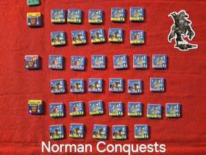 e le varie interpretazioni storiche l’esercito del normanno di Guglielmo il conquistatore era composto da circa 8000 unità. Una buona metà dell’esercito era composto da fanteria pesante e media con 2000 cavalieri e 1500 arcieri al seguito. Sorprendentemente sia il wargame Viking della SPI che Norman Conquests della GMT rispettano tale numero, anche se notiamo una maggiore varietà ( incredibile) nel wargame della SPI in cui troviamo sia cavalleria pesante che media. La fanteria in Norman Conquests non è per nulla differenziata, mentre abbiamo in Viking sia fanteria scelta pesante che media. Invece nella nuova proposta della serie Men of Iron maggiore attenzione viene data ai leader storici presenti sul campo di battaglia. Al di là della maggiore semplificazione in Norman Conquests, entrambi gli ordini di battaglia sono soddisfacenti con un rapporto fra il numero dei counter sul campo e le reali dimensioni dell’esercito normanno ( una scala di 250 soldati per counter in Norman Conquests contro i 150 di Viking).