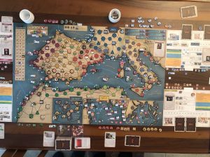 Mi dedico poi alla cacciata definitiva dei mori rivoltosi che, dopo la resa dei Nasrid, controllano ancora una chiave nel sud della Spagna. Hanno solo una unità regolare e in due impulsi riesco a ripulire finalmente e del tutto la Spagna dagli infedeli. Ora mi mancano 2 chiavi. Spendo un paio di CP per aumentare la mia influenza su Venezia, che ero riuscito ad accaparrarmi verso l’inizio della partita, ma che poi i francesi mi avevano sottratto. Ho in mano l’evento “Intrigo veneziano” (ancora!), che mi consentirebbe di avanzare di una casella diplomatica su Venezia e di prenderne automaticamente il controllo senza tirare il dado se nessuno è almeno al mio livello. I francesi nasano il pericolo e rispondono spendendo 2 CP per mantenere il vantaggio che avevano. Se va avanti così toccherà giocarsi il controllo di Venezia ai dadi, arrivando tutti e due sulla casella massima (6). Ora tocca al mussulmano, che decide di darsi finalmente alla pirateria, dato che con il portoghese non è che gli dica molto bene. Decide di attaccare la Spagna. Io ho schierato le flotte in mare, ma i possedimenti spagnoli sono così estesi che è impossibile difenderli ovunque. Il pirata Barbarossa agisce vicino a Barcellona ed ottiene 2 hits. Uno posso concederlo consentendo al mussulmano di guadagnare un PV per la pirateria (non lo sottrae a me), ma l’altro devo concederlo, non avendo squadroni navali nei pressi, consentendogli di pescarmi a caso una carta. Tremo all’idea che mi prenda la carta della Navarra! Per mia fortuna mi pesca la carta “Morte di Isabella”, che nel suo impulso successivo gioca subito. Ora non potrò conservare carte.
