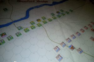 Una bellissima partita introduttiva oggi con l’amico Carlo Diolaiti nelle piane dello Yorkshire. Gli inglesi partono alla carica al primo turno inanellando tre attivazioni continuative. La migliore partenza possibile. Ma i dadi non rotolano altrettanto bene sui tiri per gli shock della prima linea. E gli inglesi si piantano sul muro di scudi norreno.