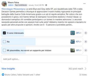#ilsondaggio #blueandgray La serie Blue and Gray della SPI, poi ripubblicata dalla TSR e dalla Decision Games permette a chiunque di approcciare il nostro hobby rigiocando le principali battaglie della Guerra Civile Americana grazie a un set di regole semplice. Per coloro che non possiedono il gioco, non hanno tempo di stamparsi l’occorrente esistono i moduli Vassal. La domanda è semplice: chi vorrebbe partecipare a un torneo in maniera asincrona ( o secondo necessità personali anche con sessioni live) sulla serie? Abbiamo inserito tre opzioni e lasciamo lo spazio per altre proposte e opinioni. Anche con 6 – 8 persone si potrebbe partire…